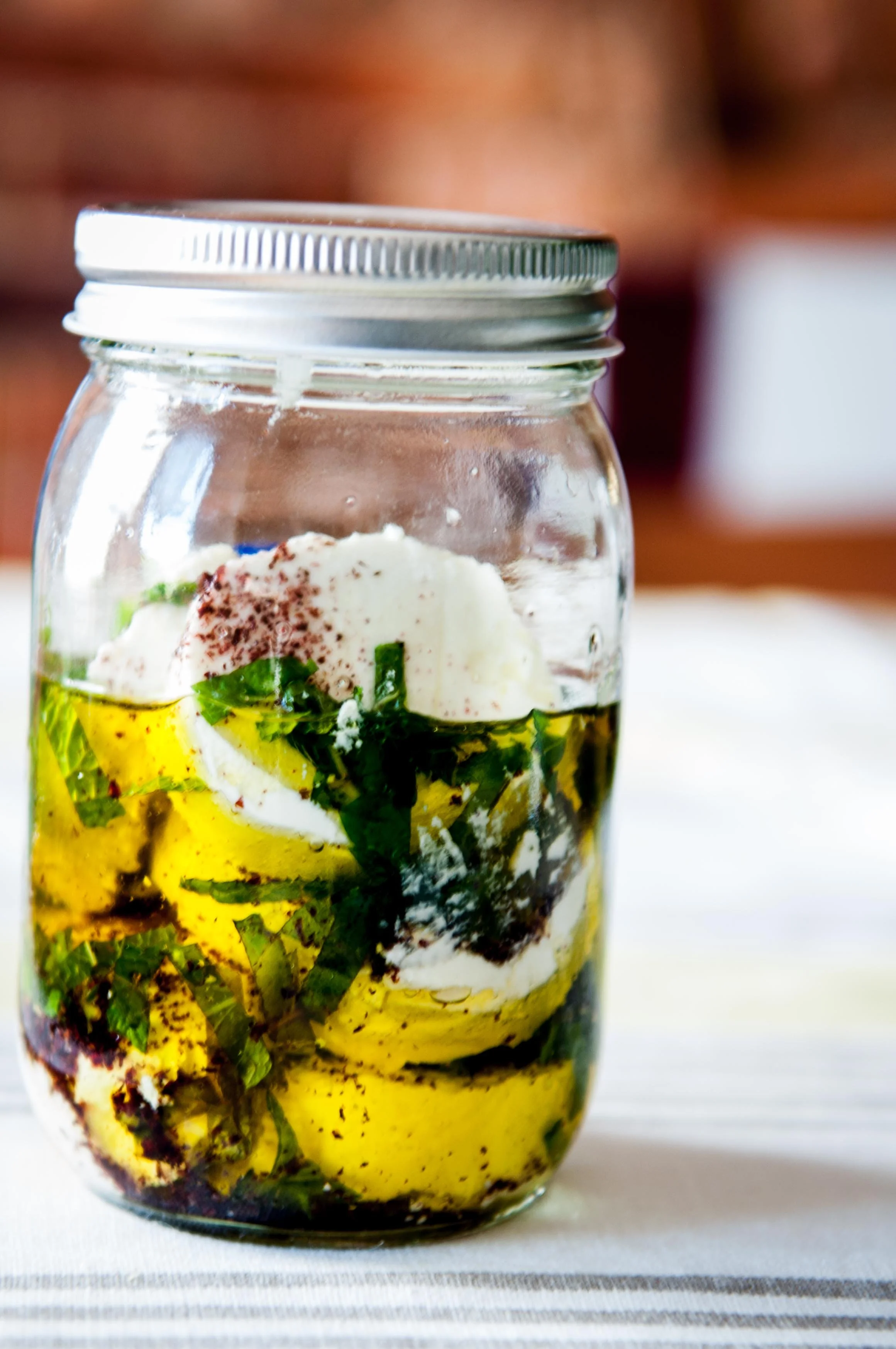 Cut the log in to ~ 1 inch discs. In a jar pour some olive oil at the base. Add the first disc in. Sprinkle with sumac and fresh mint. Top with olive oil. Add the next disc. Repeat the process and finish with enough oil to reach the lip of the last cheese slice.
